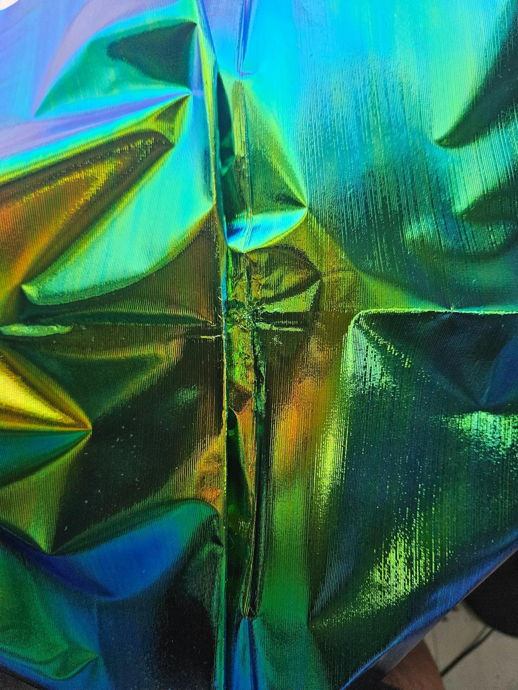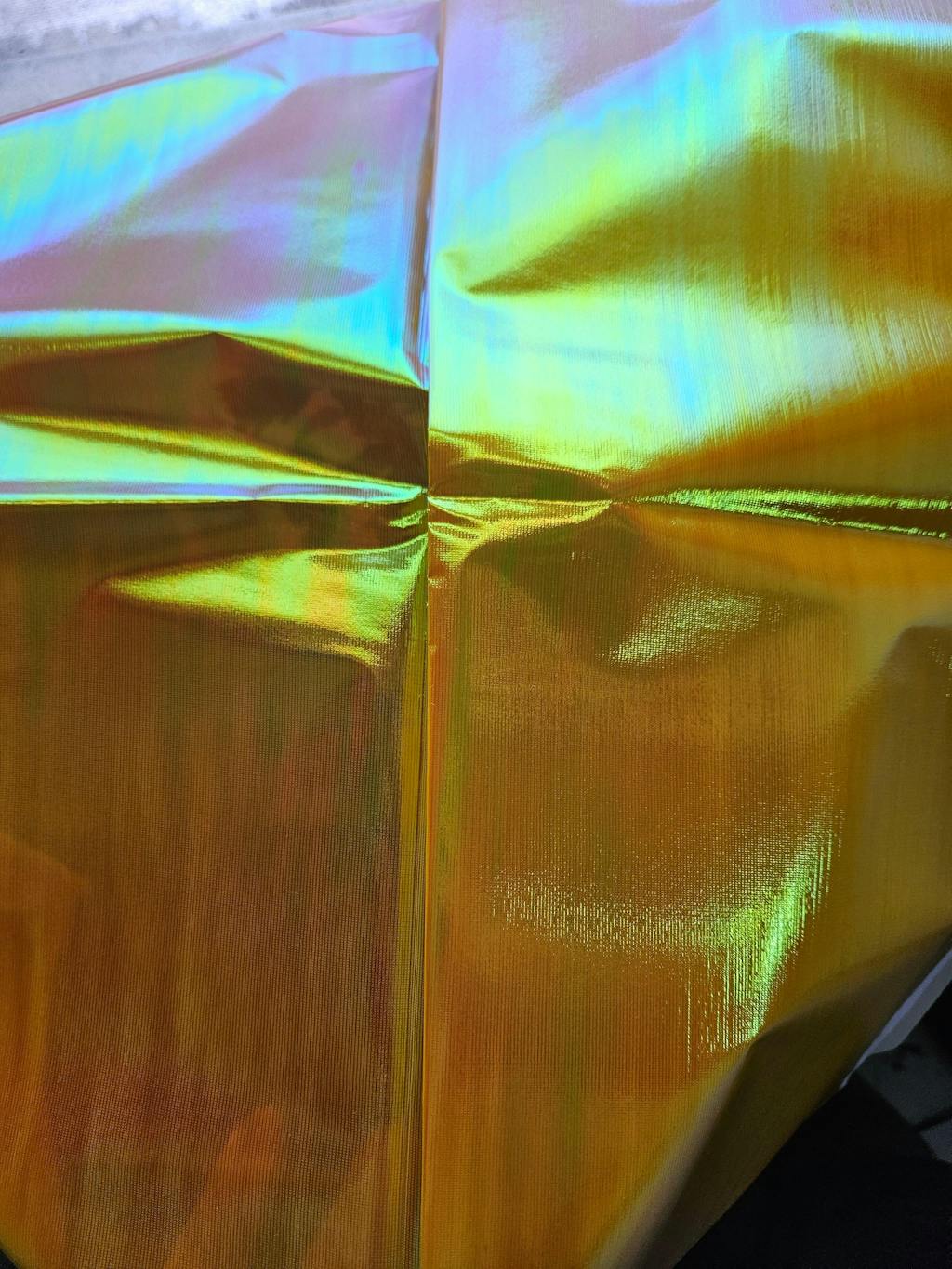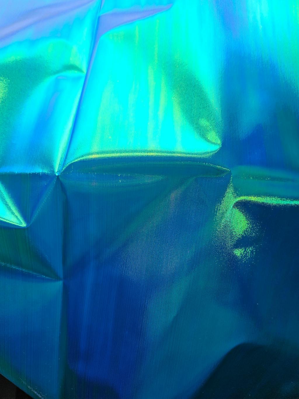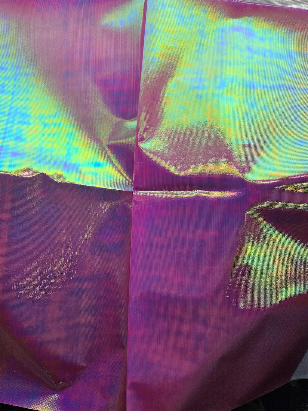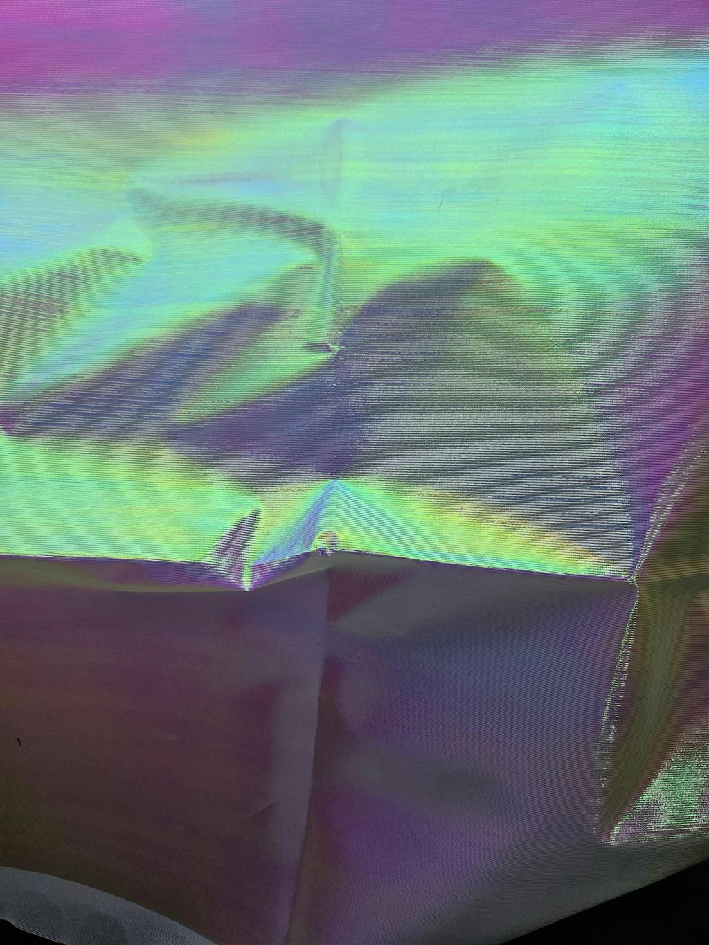 I bought several colors of the fabric and I am pleased with all of them. The material is crinkly and feels similar to a thin outdoor tarp. I am using it to make wings for cat toys. Cats love this shiny and crinkly fabric. The pictures were taken in sunlight to show the iridescence.