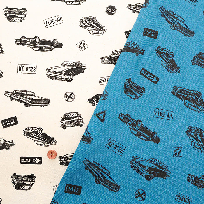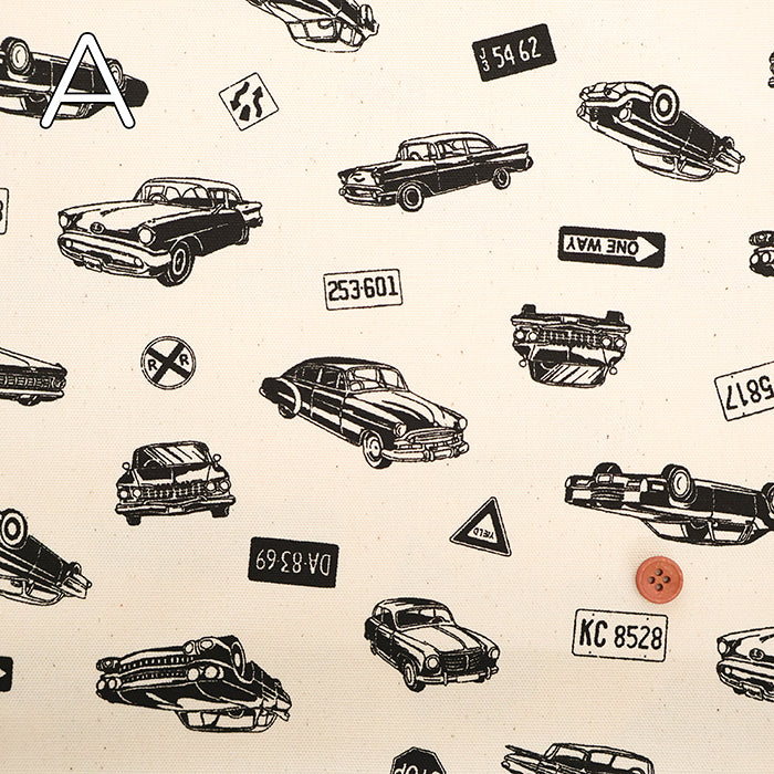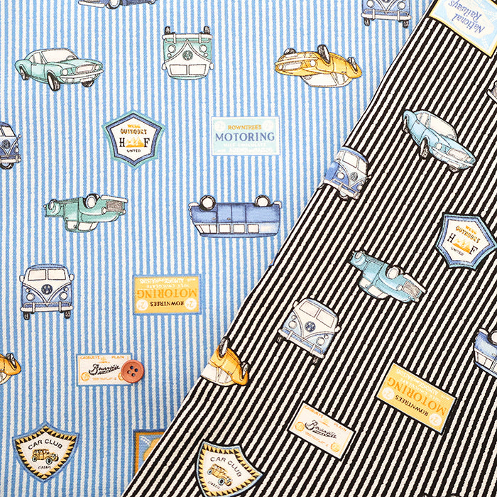 Cotton Oxford Print Fabric - Vintage cars ×Stripe