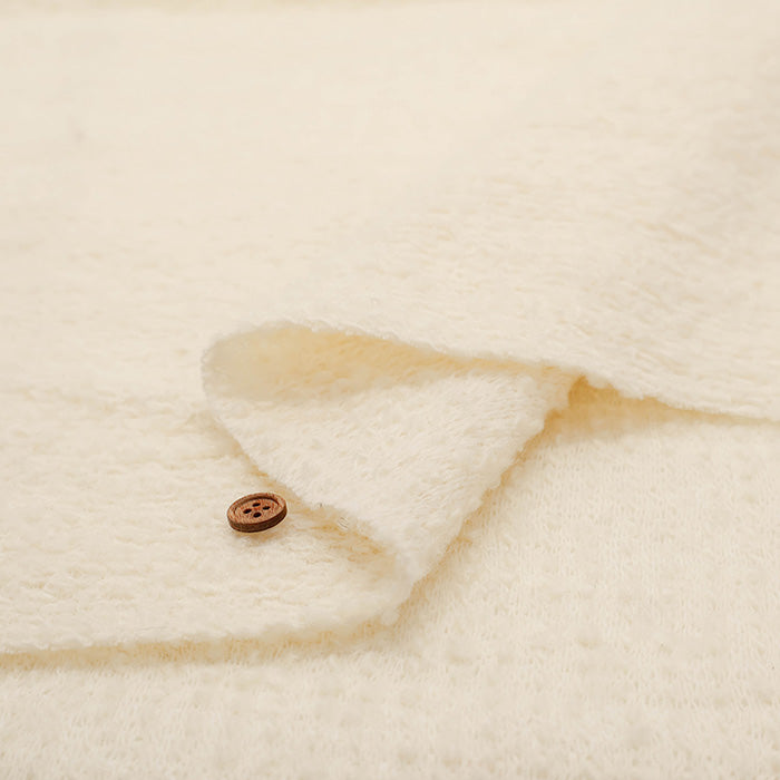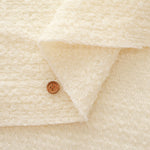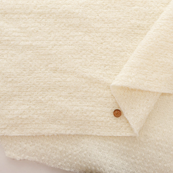 This knit fabric is made by compressing jersey material using curly looped yarn, creating volume and surface texture.