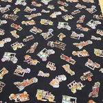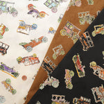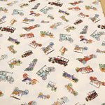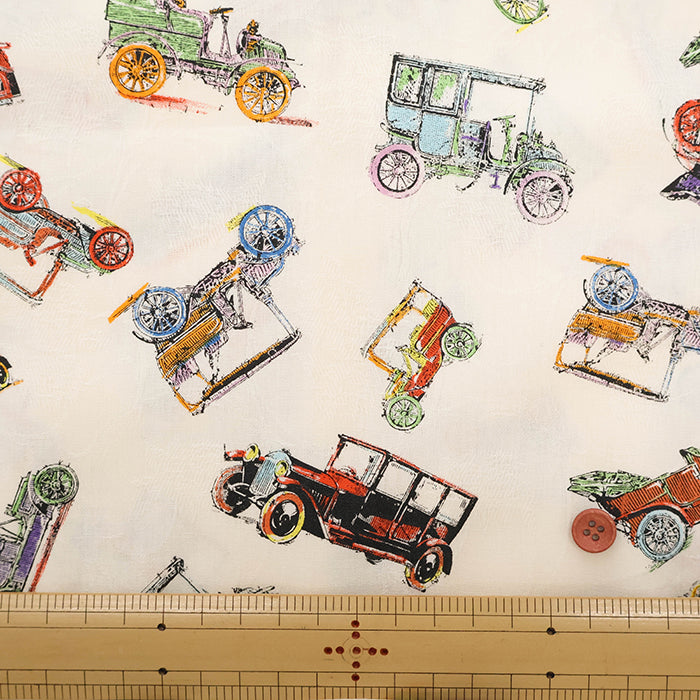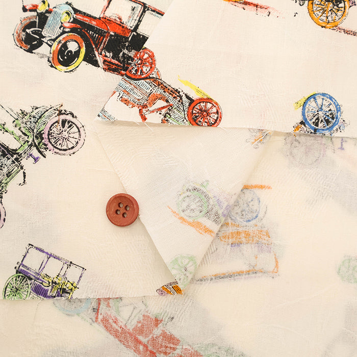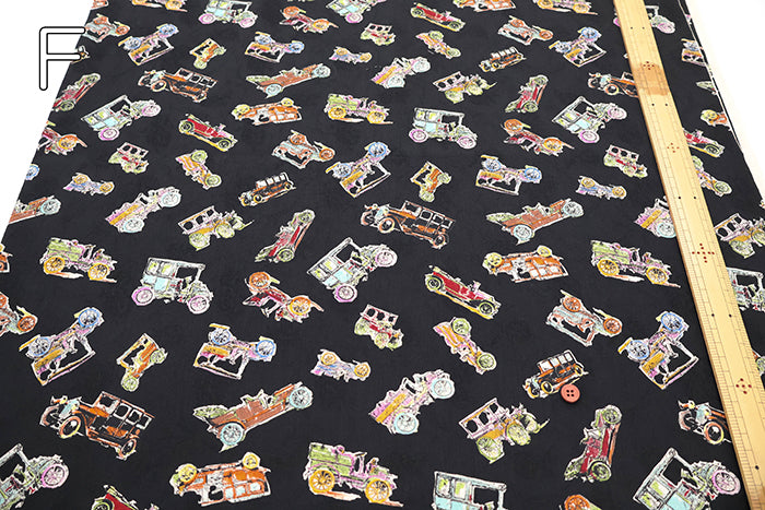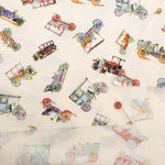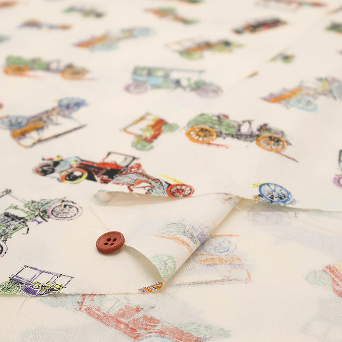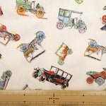 This fabric features a floral jacquard base with a Vintage Cars print.