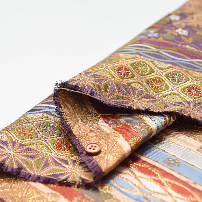 Kinran is a type of weft weaving in which gold and silver threads are mixed with colored threads to create a raised pattern.