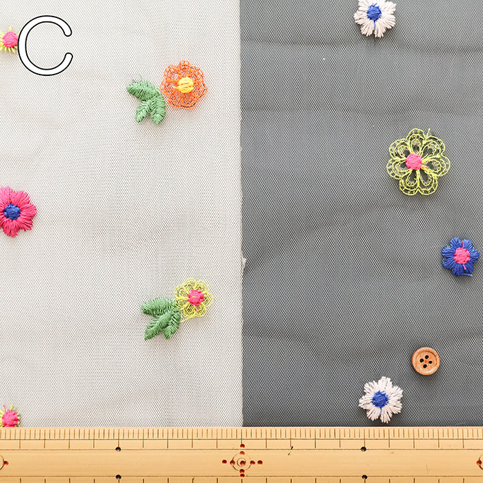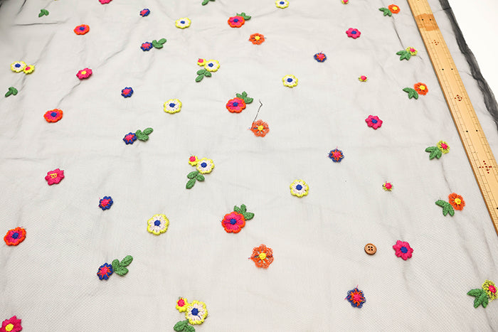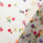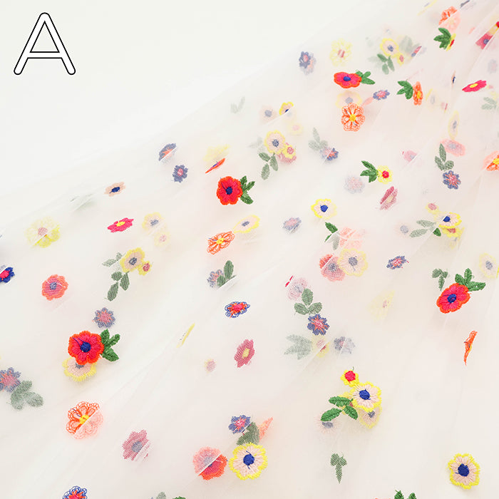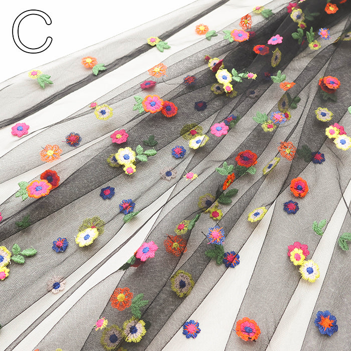 This is a beautiful fabric with colorful floral embroidery on tulle.