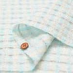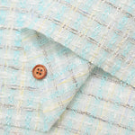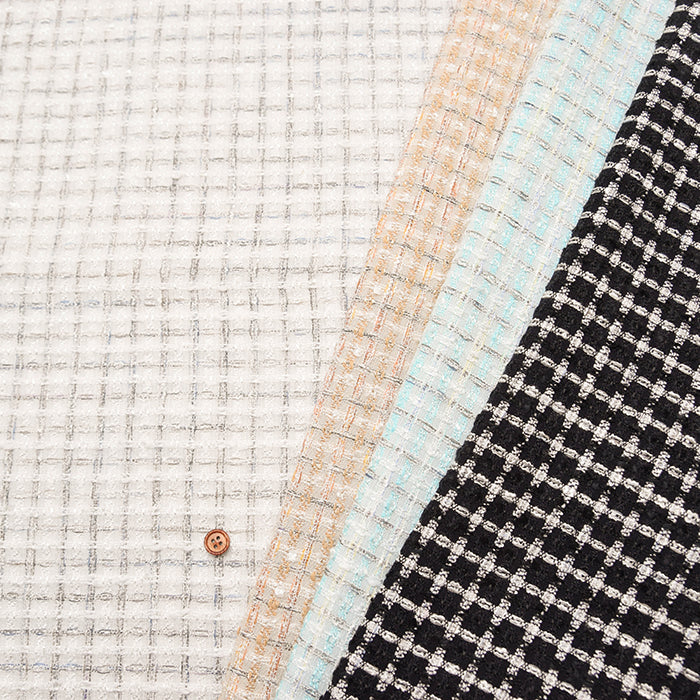 Un tweed lujoso con múltiples colores en patrones verticales y horizontales.