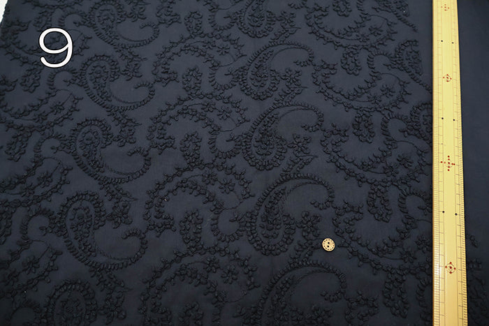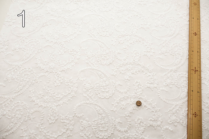 An elegant fabric for clothing, featuring dimensional cord lace embroidery on sheer lawn fabric.