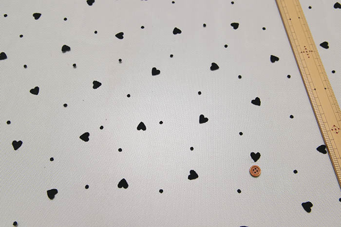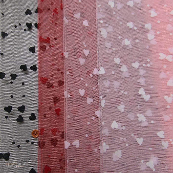 Esta tela de tul tiene un diseño lindo con un patrón de corazón hecho de rayón.