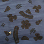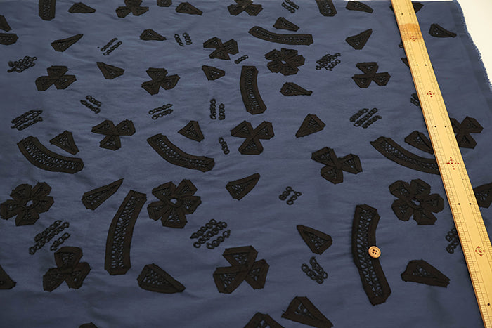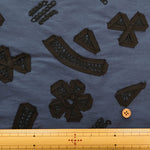 A polyester fabric with a firm texture, embroidered with flowers and motifs.