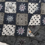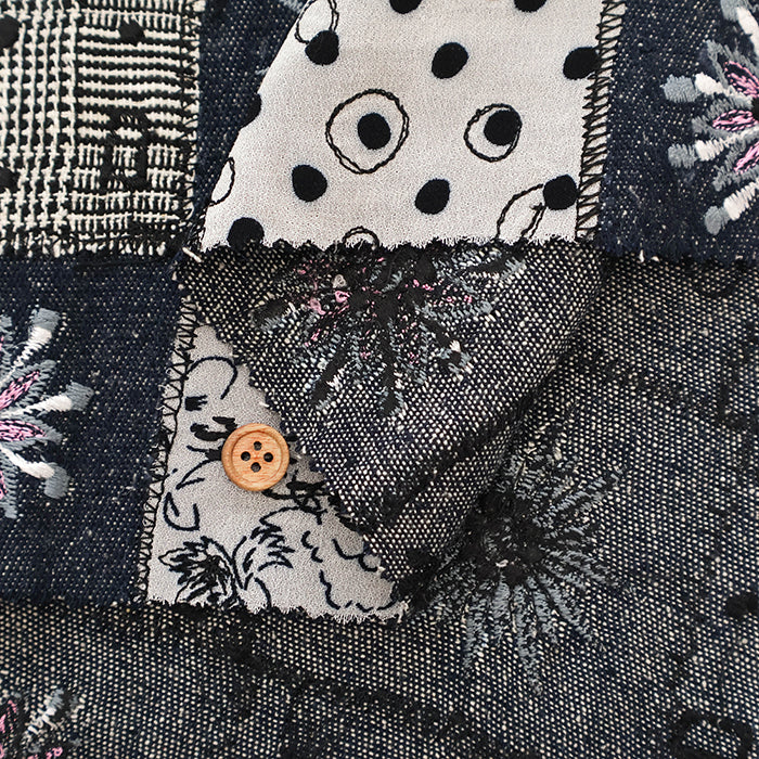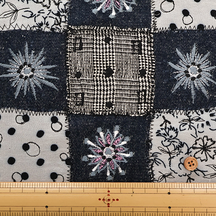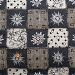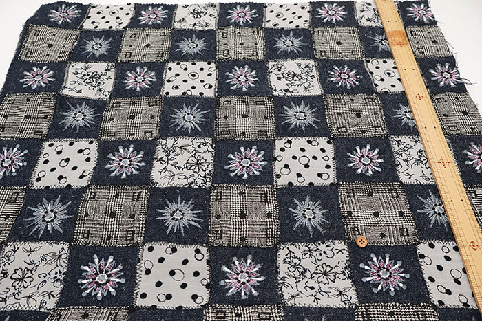 An attractive fabric featuring denim-like material embroidered with lovely flowers, patchworked together with check and dot fabrics.