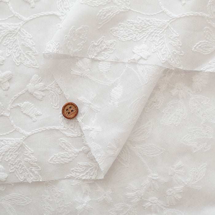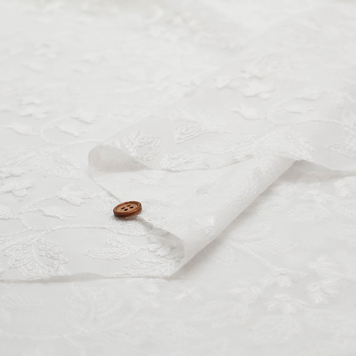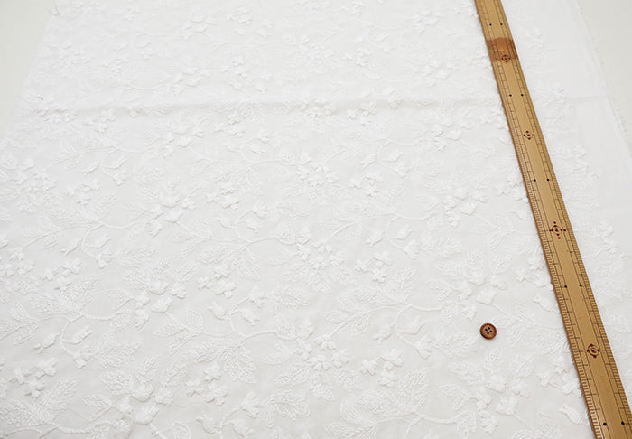 Elegant fabric for garments, featuring three-dimensional cord lace embroidery on sheer lawn fabric.