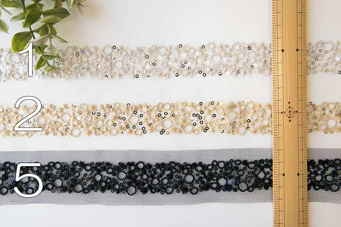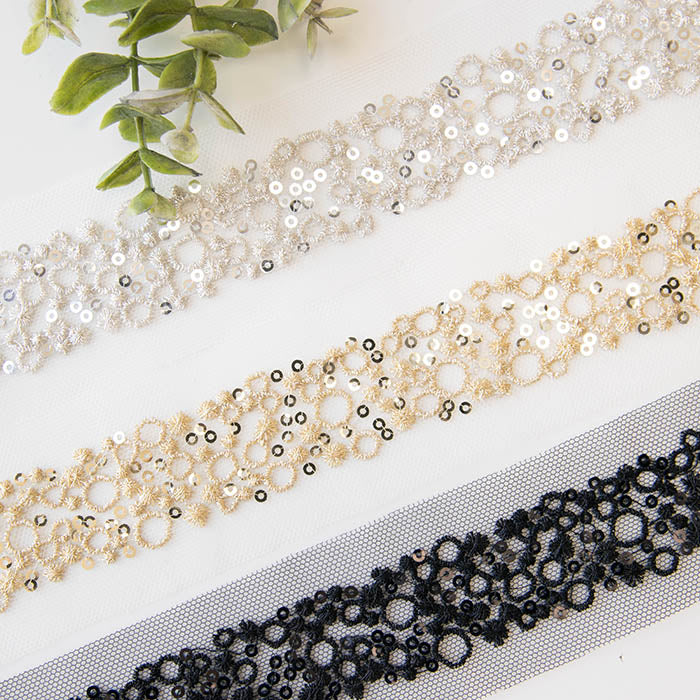 개방형 패턴을 가진 수 놓은 직물 또는 튤. 반짝이는 스팽글은 우아한 마무리를 제공합니다.