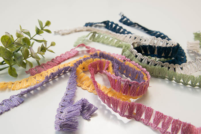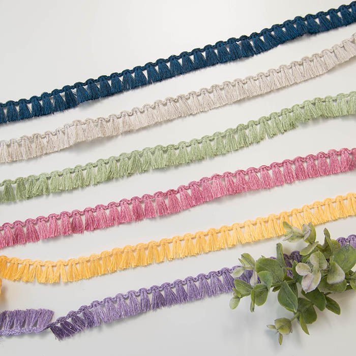이 프린지 테이프는 강한 린넨 분위기가있는 다양한 색상으로 제공됩니다.