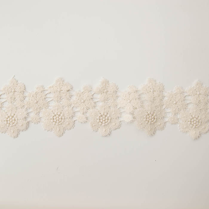 자수 레이스는 자수 레이스 기계를 사용하여 직물이나 튤의 개방형 패턴으로 자수됩니다. 이 레이스는 가장 널리 사용되는 레이스 유형이며, 일부 직물은 손상되지 않은 상태로 남아 있으며, 다른 직물은 구멍이 있으며, 기본 직물이 용해 된 후에도 자수 실이 남아 있습니다.