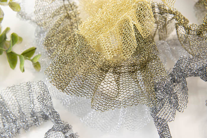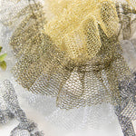 우아한 마무리를 위해 반짝이는 절름발이 실이있는 훌륭한 얇은 명주 그물 같은 직물.