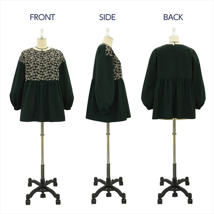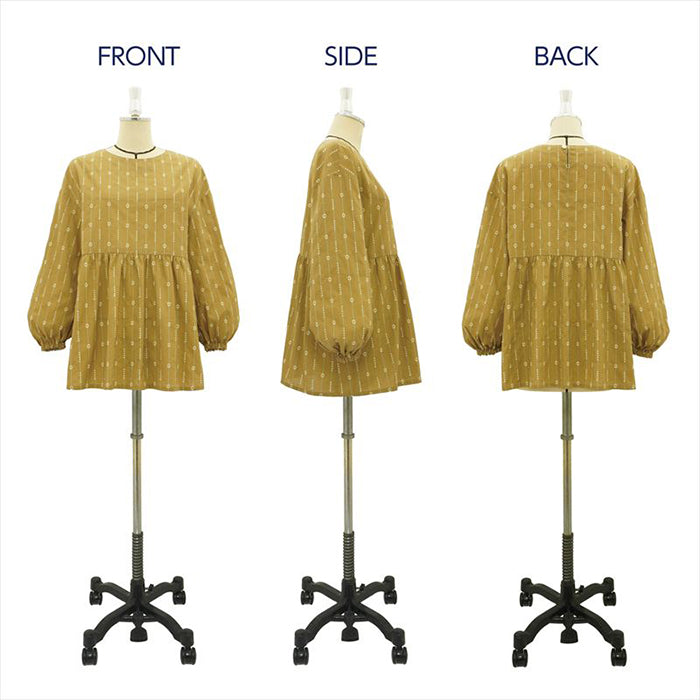 A pull-on blouse with a high waist seam that enhances leg length, featuring a softly gathered peplum that covers the waist and hip area.